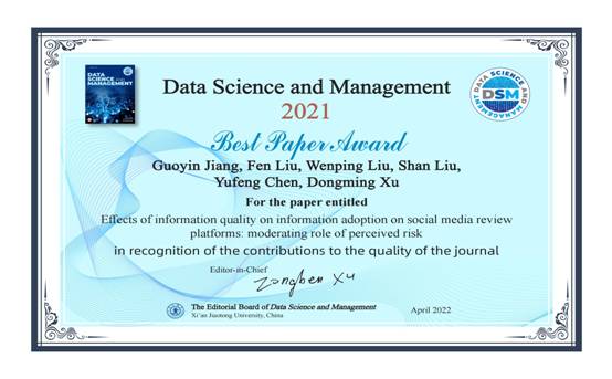 近日,公司教师刘芬和刘文平参与合作完成的论文《Effects of information quality on information adoption on social media review platforms: moderating role of perceived risk》被Data Science and Management(DSM)期刊授予2021年度最佳论文奖(Best Paper Award)。该文分析了消费者采纳社交媒体口碑信息的决策过程和行为机理,研究结果对社交媒体服务商优化平台口碑信息质量,为平台消费者提供更好的信息服务具有重要启示,目前Google引用19次。