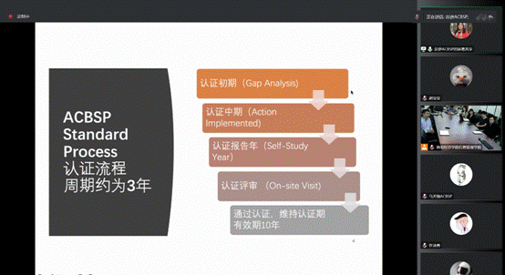 ACBSP中国区负责人彭彦从ACBSP和AACSB的区别、为什么要做ACBSP认证、ACBSP认证的流程和周期、以及认证标准等方面对ACBSP认证进行了基础性介绍。ACBSP中国区辅导员许冰青对ACBSP首次申请认证的工作流程进行了更加细致地讲解,包括学年度工作计划、数据整理、老师培训、问卷调查等工作环节的具体内容、执行步骤、注意事项等。