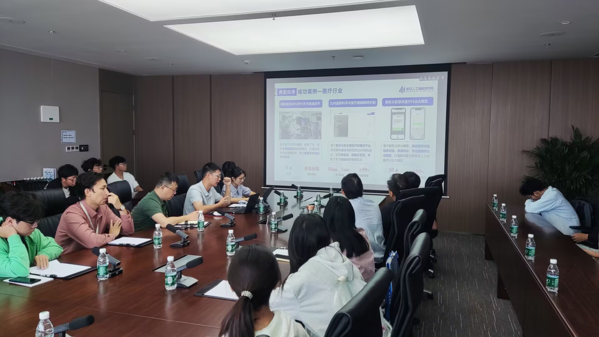 随后,一行人在会议室进行了座谈。武智院商务总监高宇、解决方案架构师周佳伟、商务经理陈阳作为企业老师,与同学们进行了深入的交流。企业老师详细介绍了大模型的发展历程和行业现状,重点讲解了武智院自主研发的“紫东太初”大模型,以及在医疗、工业、教育、政务等领域的应用实例。在交流环节,企业老师们针对同学们关心的信息管理专业在人工智能领域的就业前景、就业方向、岗位要求等问题进行了耐心解答。