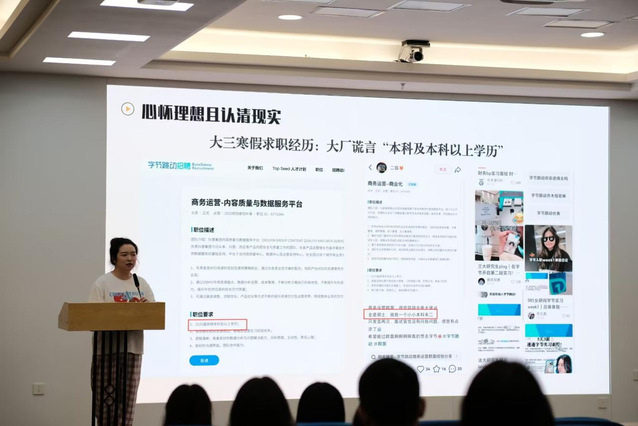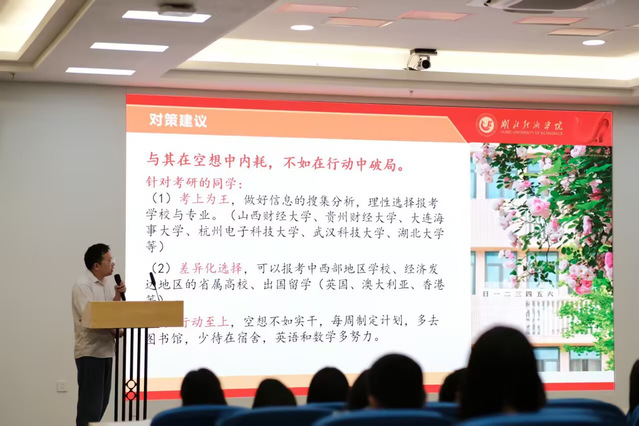 在考研分享环节,三位优秀毕业生结合自身经历,围绕院校选择、时间规划、备考方法、心态建设等各方面展开交流。考取华中师范大学的丁蕊结合自身经历,强调心态建设的重要性,从“焦虑三问”到“崩溃场景应对”,她指出扎实基础和合理规划的重要性。考取安徽大学的潘雨梦重点分享了专业课备考经验,她建议同学们要深入研究目标院校考纲,建立系统的知识框架,并详细介绍了各科目的复习策略,包括数学的题海战术和政治的真题研读方法。考取武汉理工大学的李宜桐则聚焦英语备考,详细讲解了“词义归类记忆法”等各类学习方法,并分享了如何将社交媒体转化为学习工具的心得。