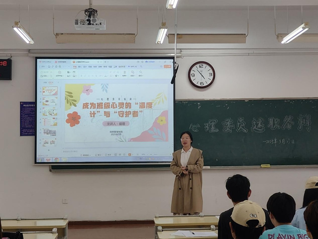 答辩结束后,心理专干崔老师进行总结,并以“成为班级心灵的温度计与守护者”为主题,从心理委员四维身份认知、工作边界清单、识别信号与方法解读为全体新委员为进行专题培训。她充分肯定心理委员“知心人”“护航者”的角色定位,并强调:“心理工作无小事,心理委员既要保持敏锐的观察力,也要用真诚和共情搭建信任的桥梁。”大家要持续关注同学动态,提升专业服务能力,同时鼓励大家“以心暖心,用爱护航”共同营造温暖互助的学院氛围。