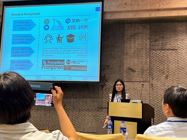 会上,曹翠翠作题为《Selling in prompt marketplace: An empirical study based on the joint effects of linguistic and demonstration signals on prompt sales》论文分享,详细介绍了其研究背景、方法、数据收集和分析过程,以及主要发现和结论,展示她在电子商务领域的最新研究成果,吸引了与会专家和学者的广泛关注。