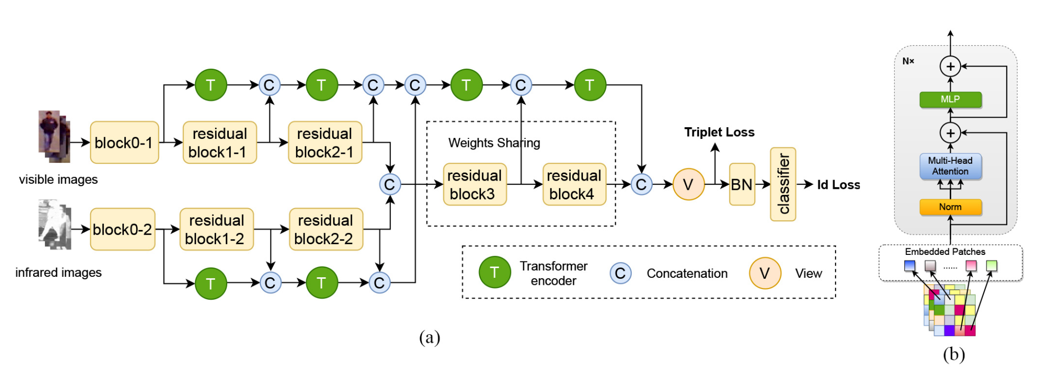 课题组研究了跨模态行人重识别(ReID)和可见光-红外双模相机跟踪的问题。大部分现有的检测-跟踪工作是基于可见光ReID,它们在弱光环境下性能较差;可见光-红外跨模态ReID的主要困难源于三通道可见光图像和单通道红外图像之间的模态差距较大,以及背景杂波、遮挡等未知环境因素。为了解决这些问题,课题组使用多种方法增强可见光和红外图像的多样性,以模拟真实图像数据的复杂性;同时,将ResNet50ViT整合到特征提取骨干网络中,并使用ID损失和三重损失将模型训练建模多任务学习问题,应用动态权重平均(DWA)策略来学习各损失函数的权重。在实验阶段,将所提出的方法应用于人员跟踪领域,在两个公共数据集(RegDBSYSU-MM01)上的实验表明,本方法在Rank-1mAPmINP等性能指标上都有提升;此外,实验表明,使用基于跨模ReID方法的可见光-红外双模相机跟踪具有较高的精度,可以达到0.24米左右。