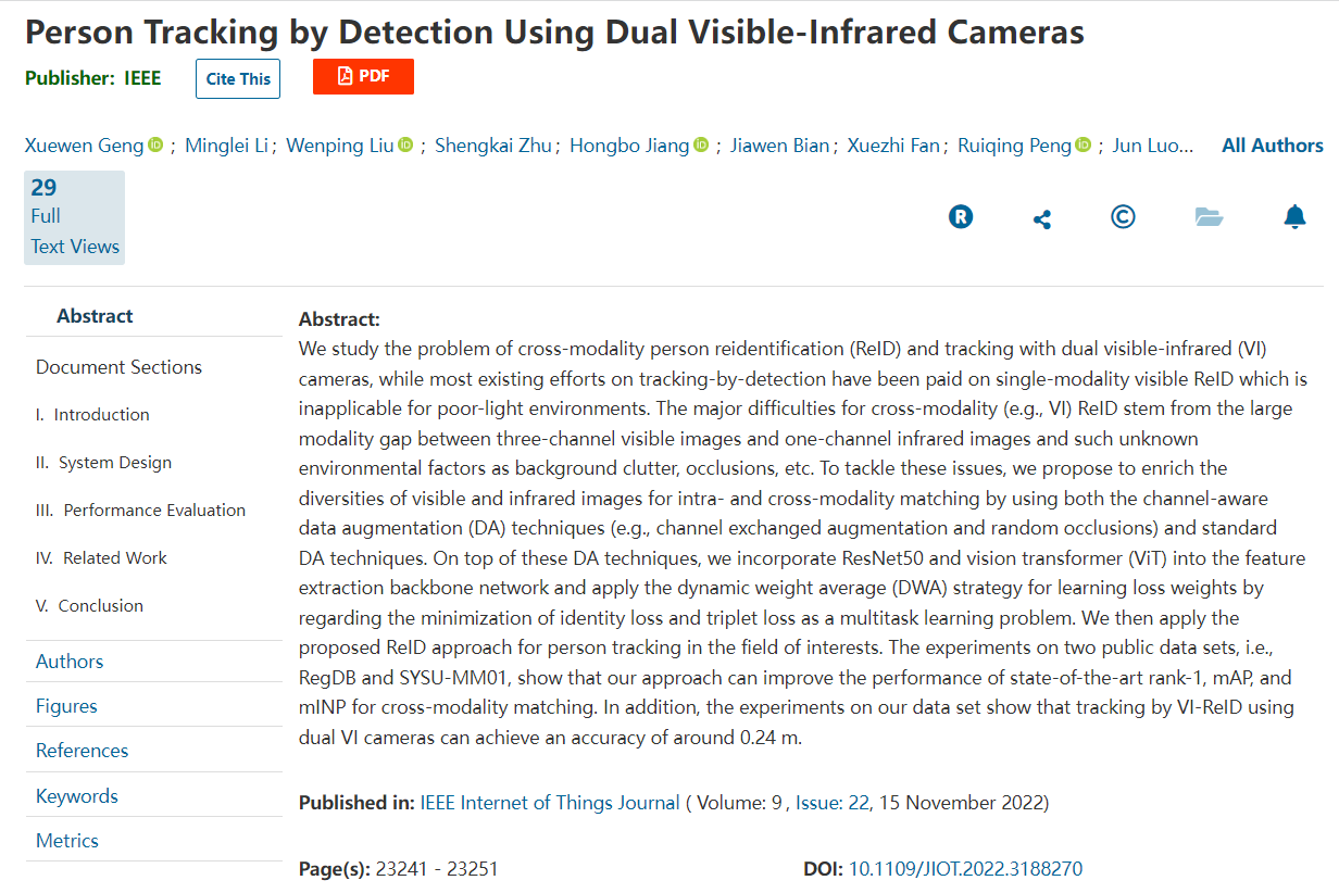 近日,公司刘文平教授团队在物联网领域国际顶刊《IEEE Internet of Things Journal 》发表了题目为《Person Tracking by Detection Using Dual Visible-Infrared Cameras》的学术论文(DOI10.1109/JIOT.2022.3188270)。公司李明磊博士为共同第一作者,刘文平教授为通讯作者。