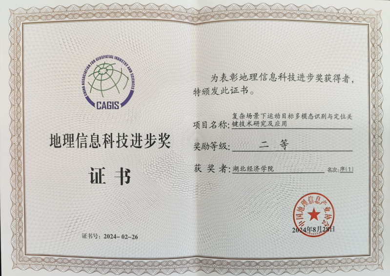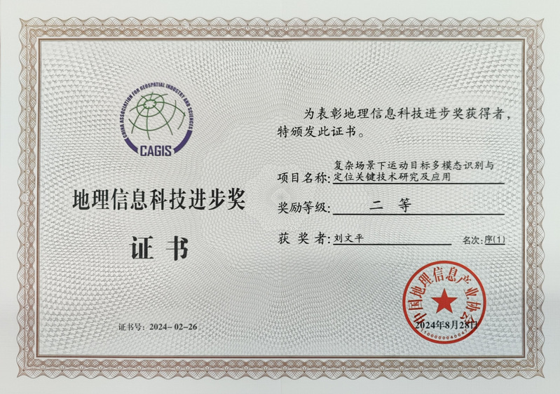 由公司作为第一完成单位、刘文平教授科研团队与多家单位合作完成的《复杂场景下运动目标多模态识别与定位关键技术研究及应用》成果获地理信息科技进步奖二等奖。该成果:提出了一种从红外热图中提取人体显著特征方法与人体定位技术,以及可见光-红外跨模态人体重识别技术,显著提升了低信噪比下的红外小目标识别与定位精度;提出了基于随机矢量环境自适应的目标监测模型与技术、基于雷达信号校准和微多普勒信号识别的无人机识别技术以及能效最优无人机路径导航技术,显著提升了复杂场景下运动目标识别与定位性能;提出了基于传感器节点间连通信息的二维/三维网络骨架提取、网络凸分解与线性化技术,解决了复杂场景下大规模传感网的目标监测与精准定位问题。该成果的工程化应用也已经取得了重大的社会效益和经济价值。