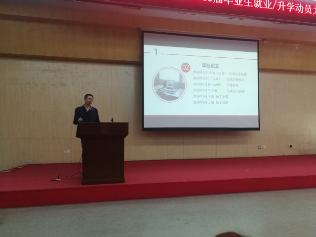 大会议程由毕业生工作要求及相关注意事项和领导动员讲话两项组成。辅导员张泳就就业/升学相关事项、毕业论文、毕业实习、离校手续和其他注意事项等五个方面提示同学们尽早做好准备工作以免因细节小事耽误同学们顺利毕业离校。