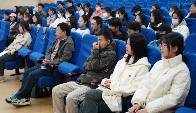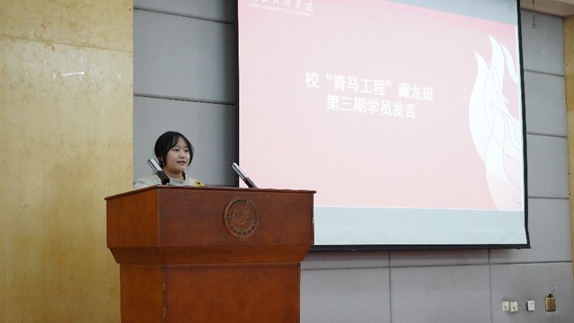 随后,校“青马工程”藏龙班第三期学员桂宜霏同学根据自身经验分享学习心得。桂宜霏回顾了在校“青马工程”学习中的收获,她认为在“青马工程”的学习经历是齐头并进、相互鼓舞的过程,提到了团队合作以及实践的重要性,强调青年应该不断开拓视野,在实践中实现自己的价值。