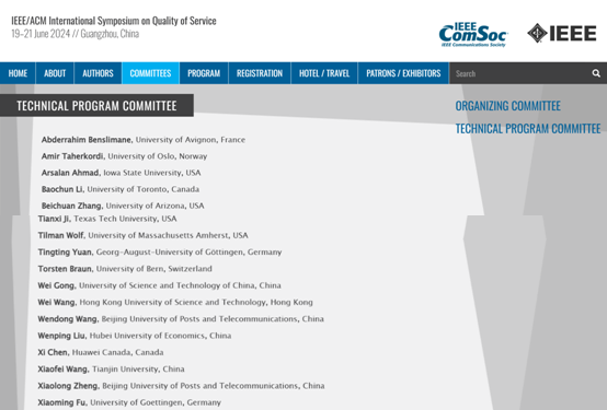 近日,学院常务副经理刘文平教授应邀担任IEEE/ACM IWQoS 2024程序委员会(TPC)委员,并参与论文评审工作。IEEE/ACM国际服务质量学术研讨会(IEEE/ACM International Symposium on Quality of Service,简称IWQoS)是由IEEE和ACM联合主办的计算机网络领域的重要国际会议,也是中国计算机学会认定的权威国际学术会议。自1993年创办以来,IWQoS就一直是网络服务质量相关领域学者分享前沿研究成果的重要学术平台,备受海内外学者的广泛关注,并在国内外享有较高声誉和广泛的影响力。IEEE/ACM IWQoS 2024将于2024年6月19日至21日在广州举行。