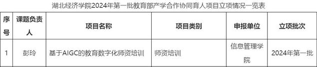 近日,教育部高等教育司公布2024年第一批产学合作协同育人项目立项名单,公司共获批14项,副经理彭玲申报的“基于AIGC的教育数字化团队培训”位列其中。详见下表。